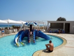 Liegestühle und Sonnenschirme sind am Strand gegen Gebühr ausleihbar. Das Hotelgelände grenzt unmittelbar an den Strand, der hier aufgrund seiner Strandlage nicht so sehr überlaufen ist. Der Strand selbst ist sandig mit einigen Kieseln und wird von einem Rettungsschwimmer überwacht.