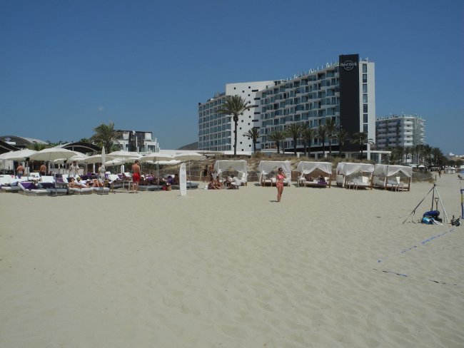 Das Hard Rock Hotel Ibiza ist das erste Hard Rock Hotel Europas am Strand und liegt direkt am langen Sandstrand von Playa d'en Bossa und verspricht besonders Musikfans einen schönen Urlaub auf Ibiza. Das 5 Sterne Hotel bietet an Hoteleinrichtungen standesgemäß einen Hard Rock Hotel Souvenirshop, 5 Restaurants, Beach Club, Außenbühne im Poolbereich für Livekonzerte, Süßwasserswimmingpool, Roxity-Miniclub, Body Rock-Fitnessstudio und den Rock Spa-Wellnessbereich. Neben den Zimmern im Hauptgebäude, dem Tower, sind rund um den Poolbereich noch einige Suiten vorhanden, die über zusätzliche Schlafräume verfügen. Die insgesamt 489 Zimmer vom Hard Rock Hotel Ibiza verfügen über Minibar, Safe, Klimaanlage, SAT-TV, Direktwahltelefon, möbliertem Balkon, Badezimmer mit Dusche und Föhn. WLAN ist nur gegen Gebühr nutzbar im Hard Rock Hotel.