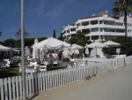 Fast 400 Meter beträgt der Weg von einem seitlichen, kleinen Hotelausgang des Hotels BlueBay Banus bis zum Strand. Östlich vom Hotel sind mehrere kleine Buchten aufgeschüttet, die somit ein ungestörtes Baden im Meer ermöglichen. Eine hoteleigene Strandbar versorgt die Gäste des Hotels Bluebay Banus direkt an der kleinen Strandpromenade. Der Strand liegt ein wenig tiefer als die Promenade, Treppen führen hier hinunter. Liegen und Schirme können am Strand angemietet werden.