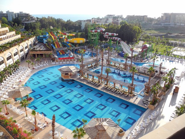 Ein echter Schwerpunkt des Luxushotels sind Wasserrutschen. Fast ein Dutzend größerer Rutschen sind vorhanden, neben steileren Wasserrutschen für Jugendliche und Erwachsene sind auch etwas langsamere Rutschen für Kinder vorhanden. Die größte Wasserrutsche ist dabei die King Cobra Rutsche, die mit Luftreifen befahren wird. Dazu kommen noch weitere Kinderbecken und Schwimmbecken für Erwachsene und ein Whirlpool. Im Hotelinneren sind noch ein Hallenbad und weitere Whirlpools im Spa und Wellness-Bereich vorhanden. An den Becken sind die Liegen, Schirme und Badehandtücher für die Gäste vom Hotel Crystal Sunset Luxury Resort & Spa natürlich kostenlos nutzbar. Im Garten sind zudem einige Hängematten nutzbar, die relaxtes Sonnen ermöglichen. Eines der À-la-carte-Restaurant ist in einer Jacht untergebracht, die in einem der Schwimmbecken schwimmt.