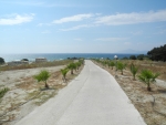 Das Hotel Kouros Palace liegt etwas mehr als 400 m vom Strand entfernt, wobei der Weg zum Strand überwiegend geteert ist und eine leichte Steigung aufweist. Liegen und Sonnenschirme können am Strand nahe dem Hotel Kouros Palace bei örtlichen Anbietern gegen eine Gebühr von den Hotelgästen genutzt werden. Ein Hotelshuttleservice hin und zurück an den Strand wird ebenfalls angeboten. Der Strand hat aber starke Wellen, die das Schwimmen erschweren. Außerdem sind im Wasser größere Steine zu finden. Rettungsschwimmer oder Umkleidekabinen fehlen direkt am Strand, dafür gibt es zumindest eine Dusche. Eine öffentliche Strandbar ist hier auch vorhanden.