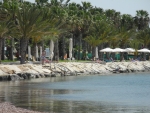 Direkt vor dem Hotel Louis Phaethon Beach ist kein herkömmlicher Strand zu finden. Eine schmale Liegefläche auf etwas Sand ist aber oberhalb der großen Steine zu finden, die hier das Land vom Meer abtrennen. Liegen und Sonnenschirme können an diesem Küstenabschnitt vor dem Hotel Louis Phaethon Beach kostenlos genutzt werden. Zugang zum Meer bieten einige Treppen über den Steinen. Diverse Wassersportaktivitäten können bei örtlichen Anbietern gegen eine Gebühr angemietet werden, wobei die Auswahl hier sehr umfangreich ist: Neben Tretbooten und Surfbrettern können auch actionreiche Wasseraktivitäten wie Para-Sailing, Motorboote, Jet Ski oder Ähnliches angemietet werden. Ein kleiner Sandstrand mit gebührenpflichtigen Liegen ist etwa 250 m entfernt, der Weg dorthin ist flach entlang einer kleinen Promenade.