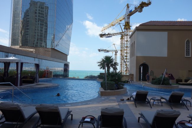 Das insgesamt eher kleine Schwimmbecken vom Hotel Mövenpick Jumeirah Beach befindet sich erhöht auf einer Terrasse neben dem dritten Stockwerk. Im linken Bereich des Pools ist ein kleines Kinderbecken integriert. Eine Ausbuchtung des Pools vom Hotel Mövenpick Jumeirah Beach verfügt über Whirlpooldüsen. Auf der Terrasse stehen außerdem Liegen zur Verfügung. Eine Poolbar bietet hier auch ihren Service an.