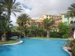 Das 4 Sterne Hotel Hotel R2 Rio Calma liegt auf einer Anhöhe am Beginn der Halbinsel Jandia in Costa Calma im Süden von Fuerteventura. Der koloniale Baustil wurde mit viel Liebe zum Detail umgesetzt. Besonders erwähnenswert ist der terrassenförmig angelegte Garten, der stufenweise vom Haupthaus zum Meer angelegt ist. Mit Wasserläufen, Wasserfällen, Liegewiesen, Pools, Bars, Wasserflächen usw. wurde hier eine aufwände Parkanlage errichtet, die direkt am Meer endet. Die Zimmer vom Hotel R2 Rio Calma sind mit Rundbögen an den Balkons auch im kolonialen Stiel aufwändig möbliert. Der Service ist rundum zufriedenstellend, das kulinarische Angebot ist sehr umfangreich. Auf die Flora wurde sehr hohen Wert gelegt, neben der Gartenanlage existiert ein großes Gewächshaus direkt neben der Rezeption. Die 384 Zimmer verfügen über Balkon/Terrasse, Klimaanlage, Safe, Minibar, SAT-TV und Schreibtisch.