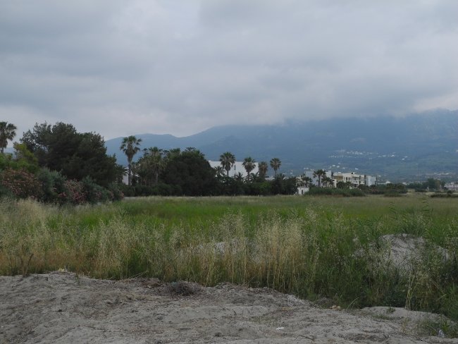 Das Hotel Tigkaki Beach liegt gut 200 m vom Strand weg, ein landwirtschaftlich genutztes Feld liegt zwischen dem Hotel und der Küstenstraße.