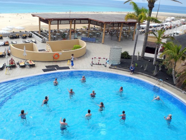 In einem der Becken wird im Hotel Iberostar Palace Fuerteventura mehrmals wöchentlich Wassergymnastik angeboten.