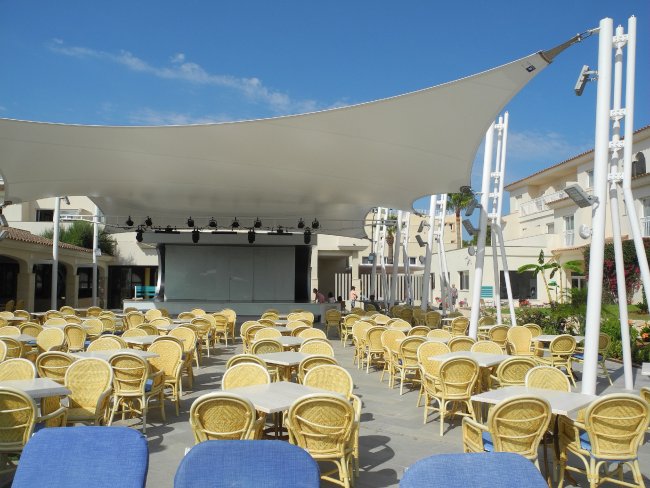 Auf dieser Bühne im Freien wird das Unterhaltungsprogramm im Aparthotel Isla de Cabrera aufgeführt.