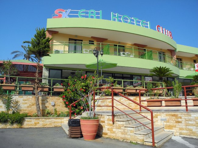 Das Hotel Eri Beach & Village, von der Straße aus gesehen. Hier befindet sich die Rezeption der großen Hotelanlage.