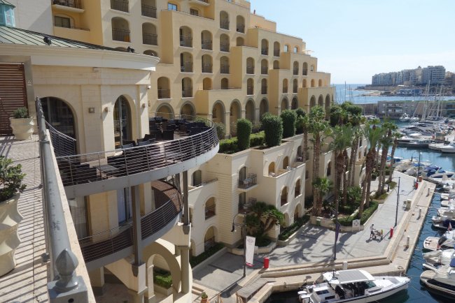 Etliche Balkone der Zimmer vom Hotel Hilton Malta haben Blick auf den Hafen.