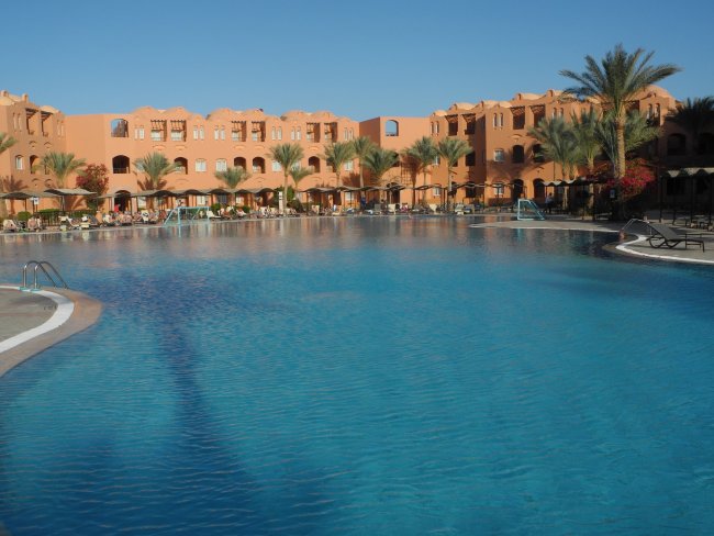 Das Hotel Jaz Makadi Oasis Resort mit seinem Süßwasserpool.