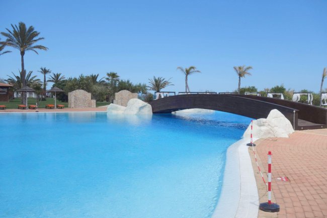 Liegen und Sonnenschirme sind im Poolbereich mit Meerblick und im Garten vom Hotel Garden Beach kostenlos verfügbar. Eine Brücke verfügt die Wege am Pool.
