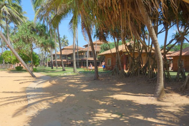 Der Garten des Hotel Ranweli Holiday Village geht direkt in den Sandstrand über. Im Garten sind dann die Strand nächsten Bungalwows kaum 10 m vom Sand entfernt.