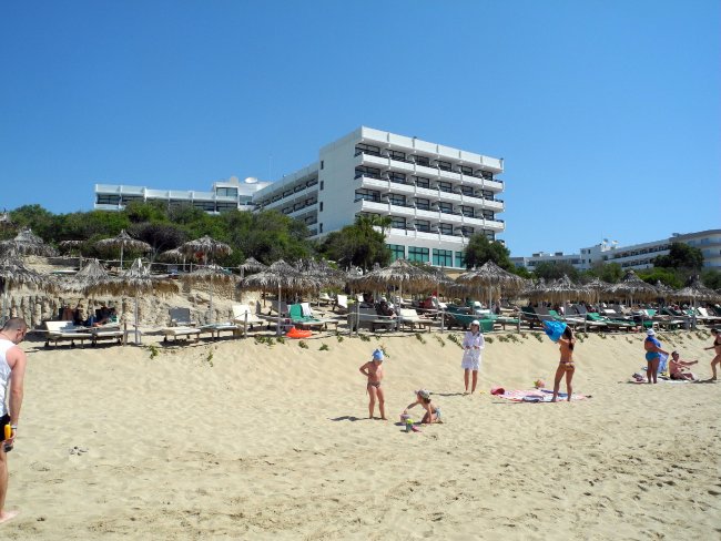 Liegen und Sonnenschirme können am Strandabschnitt vor dem Hotel Grecian Bay kostenlos genutzt werden von den Hotelgästen.