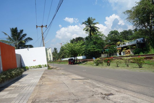 Direkt vor dem Hotel Citrus Waskaduwa liegt eine schmale Straße und daneben die Eisenbahnlinie. Züge fahren aber nur tagsüber und etwa nur einmal pro Stunde, viel Lärm ist also nicht zu befürchten.
