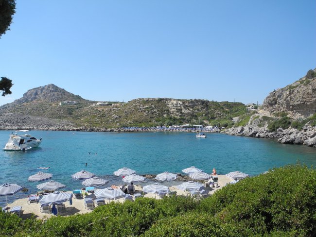 Das Hotel Cathrin (Bildmitte oben) liegt etwas erhöht über dem Strand der Ladiko Bucht, der nach 700 m erreicht werden kann.