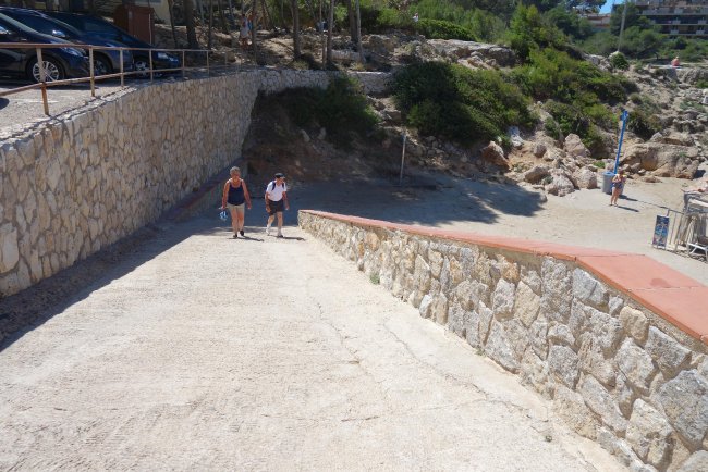 Zum Strand führt dann eine etwas steile Rampe herunter, die aber keine 10 m lang ist.