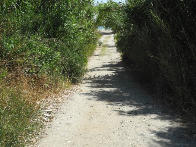 Der kürzeste Weg zum Strand vom Hotel Apollon aus ist flach und nicht asphaltiert.