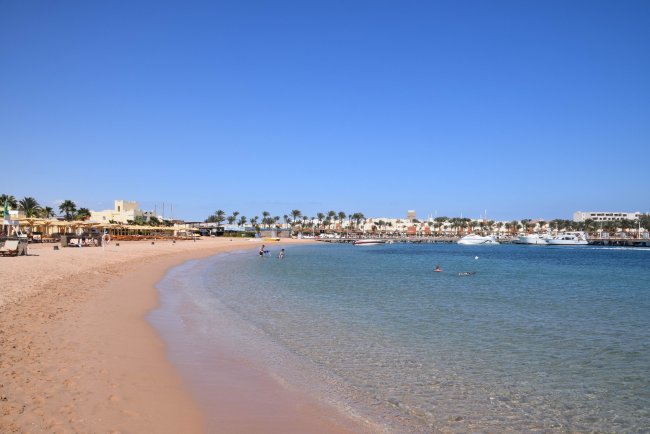 Der Strand vor dem Hotel Tia Heights fällt sehr flach ins Meer ab.