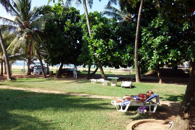 Unter Palmen und Büschen findet man genug schattige Plätze hier im Hotel Paradise Beach.