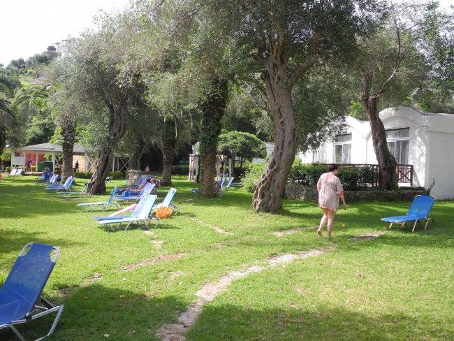 Im Garten vom Hotel Grecotel Daphnila Bay Thalasso sind ein paar Olivenbäume gepflanzt.