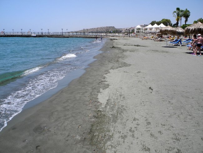 Der Strand vor dem Hotel Elias Beach ist grau und nur leicht mit Kieseln versetzt.