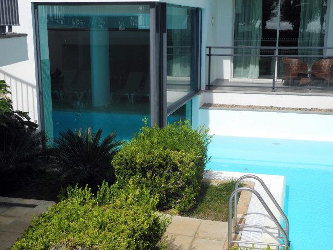 Das Hallenbad vom Hotel Vidamar Resort Madeira geht direkt in ein kleines Außenbecken über.