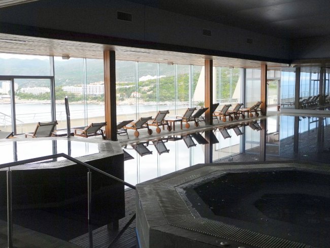 Das Hallenbad samt Whirlpools liegt in dem obersten Stockwerk des Hotels und bietet daher einen interessanten Ausblick auf das Meer.