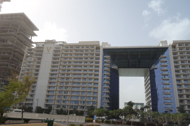 Markant ist die Lücke zwischen den beiden Gebäudeflügeln vom Hotel FIVE Palm Jumeirah Dubai - hier ist unten dann der Zugangsbereich zum Hotel.