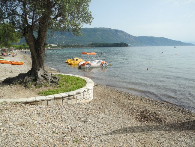 Der Kiesstrand vor dem Hotel Corfu Chandris ist schmal, ein paar Wassersportgeräte sind hier entleihbar.