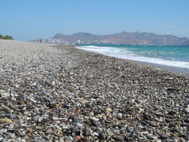 Der Strand ist stark mit Kies durchsetzt, vor allem am Meerzugang und am Meeresboden liegt eigentlich nur Strand.