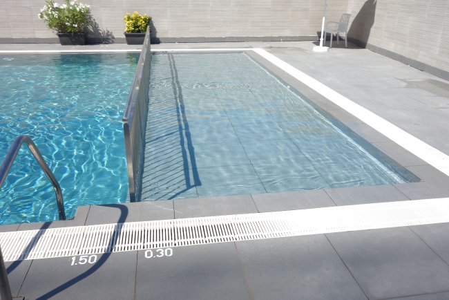 Dieses 30 cm tiefe Kinderbecken des Hotels Europa Splash ist vom Hauptbecken mit einem Gitter abgetrennt.