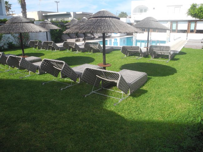 Die Poolliegen stehen im kleinen Garten auf einer Grasfläche im Innenbereich vom Hotel Smartline Meni Beach.
