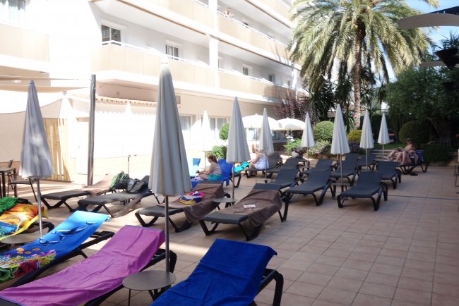 Der Bereich mit den Liegen neben dem Pool ist nicht sonderlich groß im Hotel Sumus Monteplaya Adults Only.