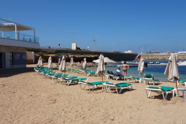 Liegen und Sonnenschirme können am beigefarbenen Sandstrand vor dem Hotel Paradise Bay kostenlos von den Hotelgästen genutzt werden.