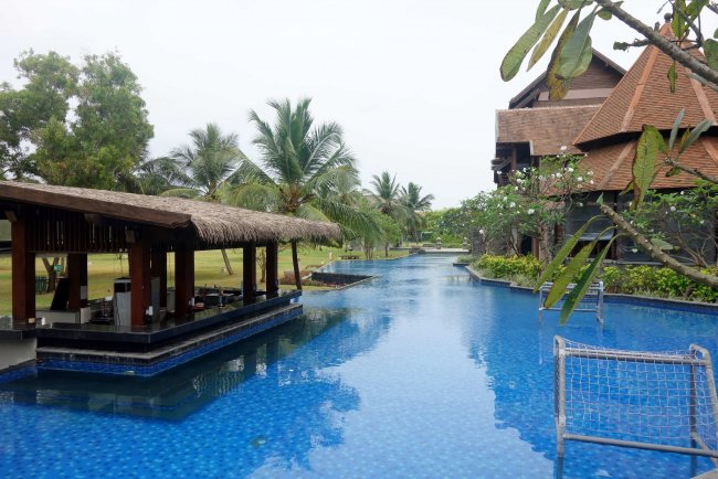 Der Pool vom Hotel Anantaya Resort Pasikudah ist sehr lang gestreckt.