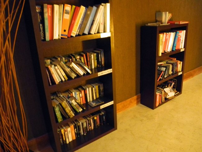 Die Gäste können an mehreren Regalen ein paar Leihbücher im Hotel Melia Madeira Mare nutzen.