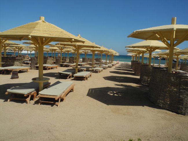 Hoteleigene Liegen und Sonnenschirme stehen den Urlaubern hier in Ägypten in der Makadi Bay vor dem Hotel Tia Heights natürlich kostenlos nutzbar.