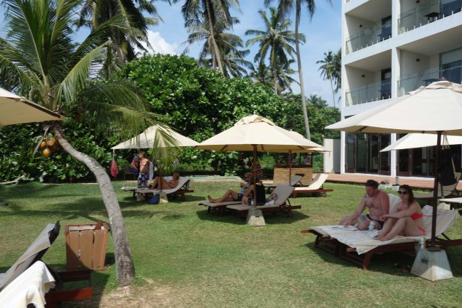 Im Garten des Hotels Shinagawa Beach finden sich Liegen mit Sonnenschirmen.