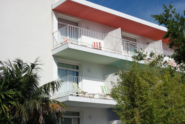 Auf den Balkonen des Hotel Ibersol Antemare Spa sind solche Klappliegestühle aufgestellt, was sehr selten vorkommt.