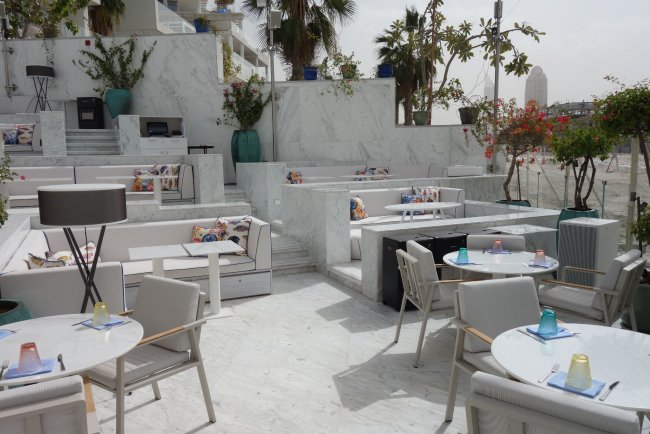 Ein Sitzbereich der Poolbar vom Hotel FIVE Palm Jumeirah Dubai ist hauptsächlich aus Marmor bestehend.