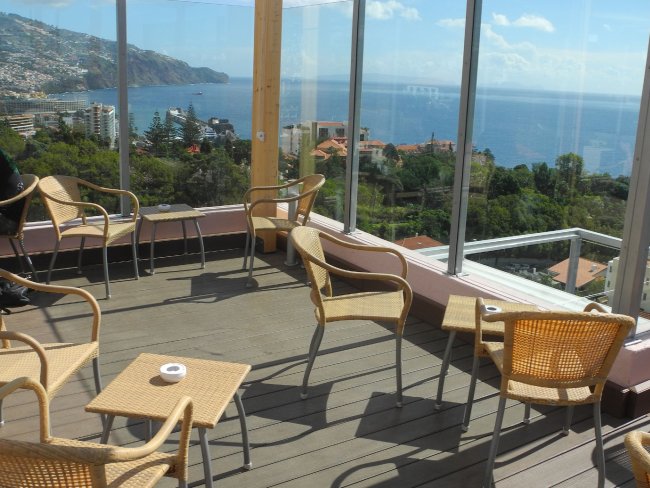 Der Sitzbereich der Rooftop Lounge auf dem Dach des Hotels Savoy Gardens bietet tollen Meerblick.
