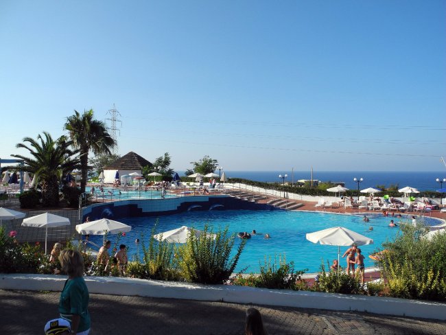 Durch die Hanglage sieht man vom Hotelgelände aus an mehreren Stellen das Meer an der Nordküste von Kreta.