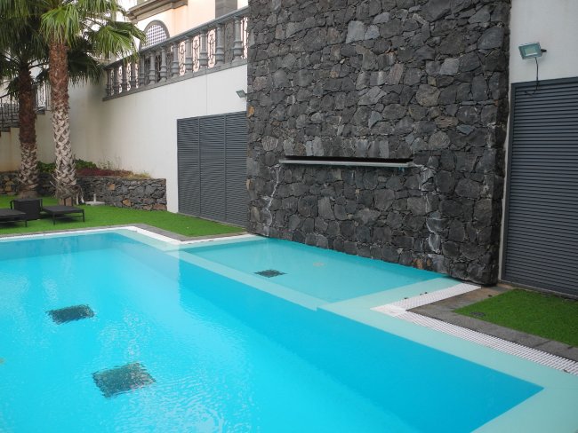 Der dunkle Naturstein bietet einen schönen Kontrast zum Pool des Hotels Quinta do Lorde Resort.