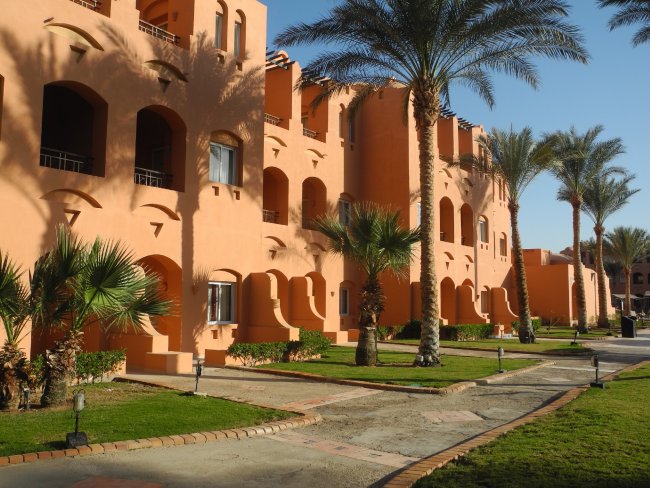 Das Hotel Jaz Makadi Oasis Resort besteht aus solchen, niedrigen Gebäuden.