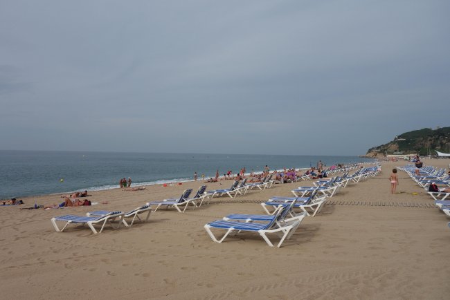 Am Strand von Calella erwarten öffentlich entleihbare Liegen die Gäste vom Hotel H·TOP Amaika und der anderen Hotels.