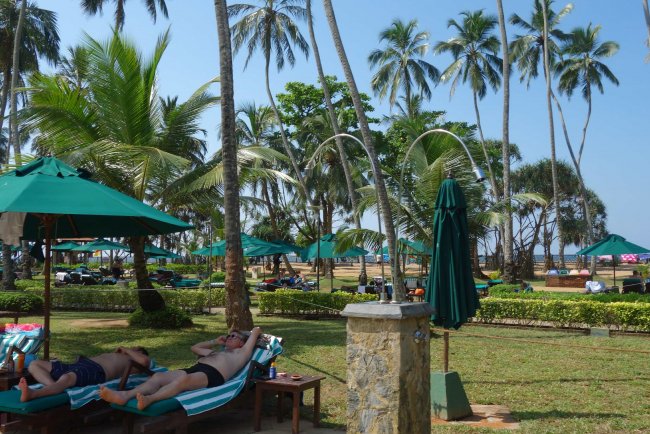 Außer Palmen sorgen auch Sonnenschirme für die Beschattung der Liegen im Garten vom Hotel Royal Palms Beach.