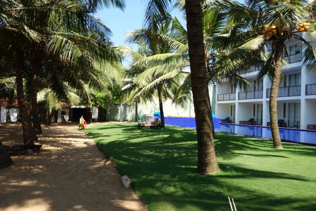 Im Garten des Hotels Jetwing Sea sorgen viele Palmen für Schatten.