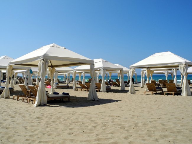 Am Strand besteht die Möglichkeit, solche großzügig bemessenen Pavillons zu benutzen.