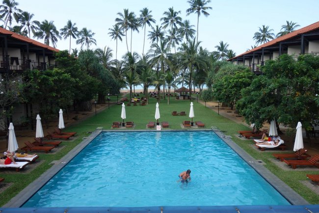 Das Hotel Mermaid liegt direkt am Strand. Der Pool und der Garten verfügen daher über Meerblick.