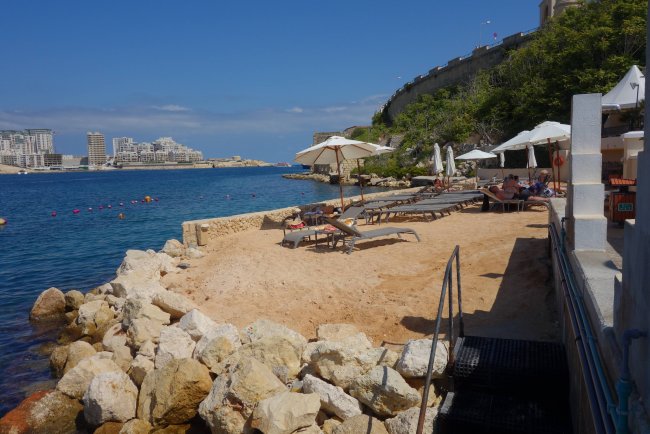 Der kleine exklusive Sandstrand für die Gäste vom Grand Hotel Excelsior.
